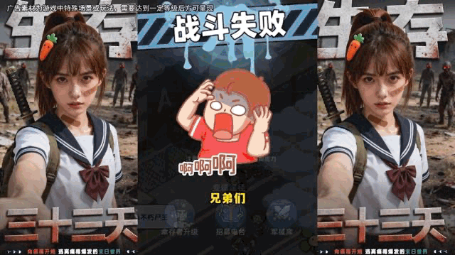 但另一方面,《生存33天》的广告素材也存在一定局限性。其创意形式相对单一,主要以“玩法展示+场景呈现”为主,缺乏剧情向、互动式等更具沉浸感的素材类型。