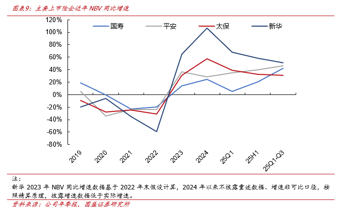 预定利率下调推升NBVM,拉动NBV普遍高增。2025年7月,人身险产品预定利率再次下调,普通型保险产品预定利率*高值下调50bps至2.0%,分红型保险产品预定利率*高值下调25bps至1.75%,低利率环境下,以分红险为主的浮动收益型产品将更具吸引力。受益于产品预定利率下调、产品结构优化、NBVM提升,2025年前三季度NBV同比较大幅增长:新华50.8%(非可比口径,详见注释)、平安46.2%、国寿41.8%、太保31.2%。