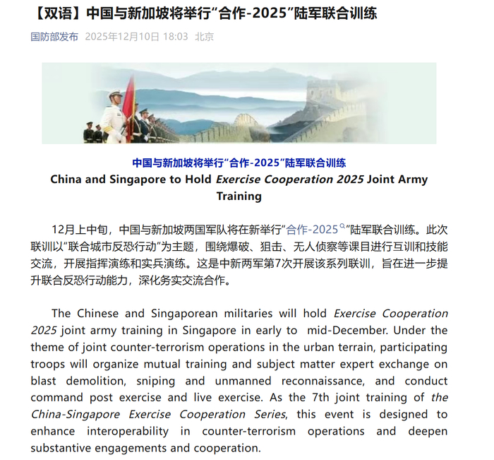 简介微信公众号“国防部发布”12月10日消息,12月上中旬,中国与新加坡两国军队将在新举行“合作-2025”陆军联合训练。此次联训以“联合城市反恐行动”为主题,围绕爆破、狙击、无人侦察等课目进行互训和技能交流,开展指挥演练和实兵演练。这是中新两军第7次开展该系列联训,旨在进一步提升联合反恐行动能力,深化务实交流合作...