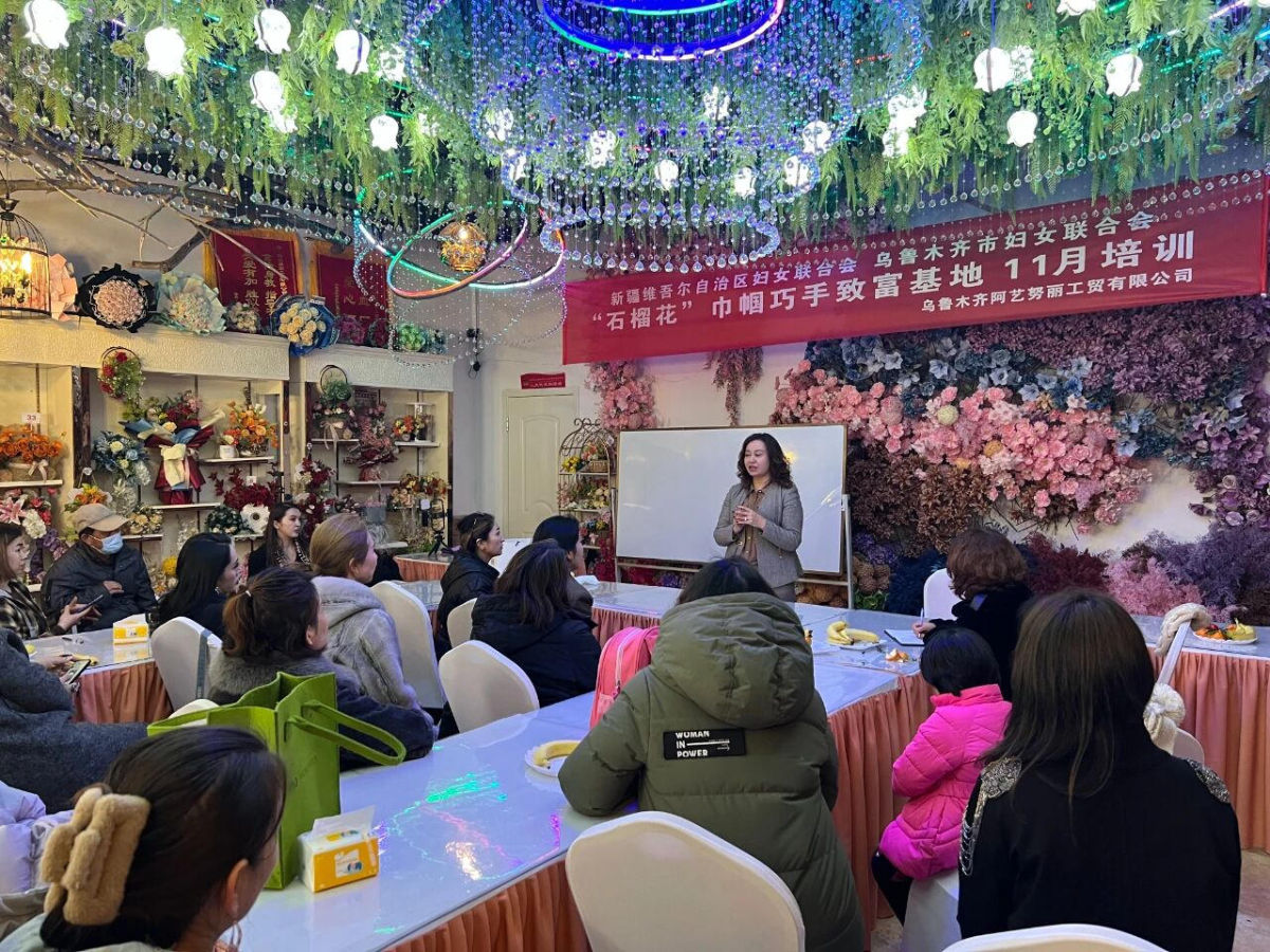 在与社区干部沟通协调后,阿依努尔于同年创办了首个花艺培训基地,为各族女性提供免费的花艺技能培训。从鲜花养护、插花技巧到店铺经营、客户沟通,她毫无保留地分享自己的经验。“一些姐妹家庭负担重,我就提供交通补贴、午餐补助,在培训基地附近协调住宿,解决她们的后顾之忧。”