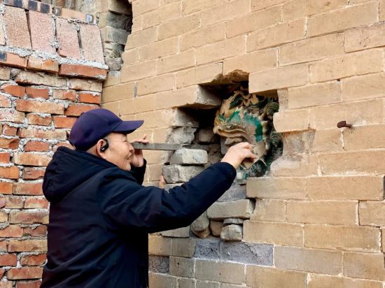 上世纪90年代,孟红胜的父亲在门殿开了个磨坊,放进机器加工粮食,*近至少十几年再也没有使用过。说着,他想起一件事,拐到一个墙洞前,把洞口的砖块一个个搬下来,露出一个篮球大小琉璃螭吻(屋脊两端的神兽饰物)。十几年前,他在后殿的瓦堆里捡出来的,怕被人拿走,就藏在墙洞里。“不知道有没有用?”他问来访者。