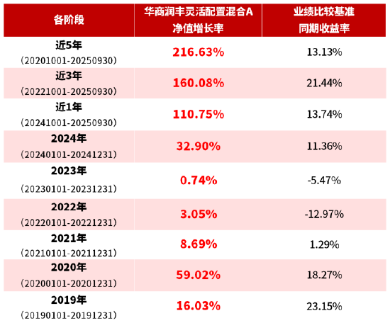 多年实战下来,这一方法论效果着实抢眼,其代表作华商润丰灵活配置混合A自2019年3月接手以来,截至2025年9月30日,该基金近5年收益高达216.63%,大幅超越13.13%的同期业绩比较基准收益率。