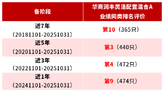 ①文中内容仅代表基金经理投资理念,文中基金经理关注的投资方向,仅为结合当前市场情况作出的判断,可能随市场情况调整,具体投资策略详见基金法律文件。基金的超额收益指区间基金净值增长率减除该基金业绩比较标准的同区间的收益率后的结果。②基金业绩同类排名评价数据由银河证券2025年11月发布,数据截至20251031。来自银河证券分类,华商润丰灵活配置混合C属于混合基金-灵活配置型基金-灵活配置型基金(基准股票比例60%-100%)(非A类),近1年、近3年、近5年业绩同类排名评价分别为6/313、2/227、1/133。③华商润丰灵活配置混合A/C各阶段净值增长率、业绩比较基准同期收益率数据来自华商基金定期报告。截至20250930,华商润丰灵活配置混合C近1年、近3年、近5年净值增长率分别为110.48%、159.29%、215.01%,同期业绩比较基准增长率分别为13.74%、21.44%、13.13%。④华商润丰灵活配置混合A成立于20170125,业绩比较基准为中证800指数(5018.7635, -2.28, -0.05%)收益率×65%+上证国债指数(224.6005, 0.15, 0.07%)收益率×35%,于20201228修改投资范围,增加存托凭证为投资标的,详阅法律文件。业绩登载期间基金经理变更情况:胡中原20190319至今;2020-2024年份额净值增长率分别为59.02%、8.69%、3.05%、0.74%、32.90%,同期业绩比较基准收益率分别为18.27%、1.29%、-12.97%、-5.47%、11.36%。华商润丰灵活配置混合C成立于20190619,业绩比较基准信息同上,详阅法律文件。业绩登载期间基金经理变更情况:胡中原20190619至今;2020-2024年份额净值增长率分别为58.78%、8.52%、2.94%、0.64%、32.77%,同期业绩比较基准增长率分别为18.27%、1.29%、-12.97%、-5.47%、11.36%。⑤截至20250930,胡中原具有11.2年证券从业经历(3.5年证券交易经历,1.2年证券研究经历,6.5年证券投资经历)。