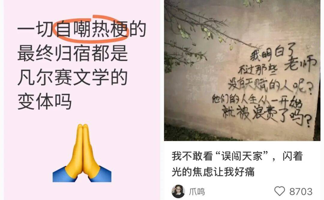 一方面,一些自我劝慰、用欣赏积极的眼光看待自己的梗,嵌入了精英话语体系,被网友批“像在向其他人炫耀自己有多优秀”。