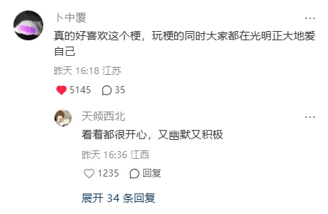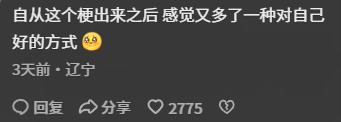“永远挑剔、永远警觉、永远不满意”的@Y_cinéma觉得,这个梗是通俗版的“爱自己是终身浪漫的开始”。它一下子把她从不必要的自我审判中捞出来,开始学着善待自己。