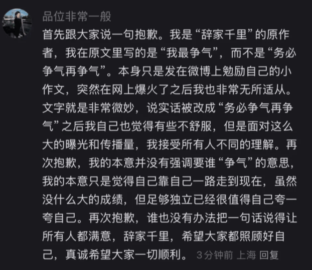 他们认为这个梗原本用于自我鼓励和认同,期待大家发自内心地活出自己喜欢的样子,“务必争气”从别人嘴里出来就像从小听到大的说教,透着一种优越感展示的观感和单一价值体系下的规训意味。