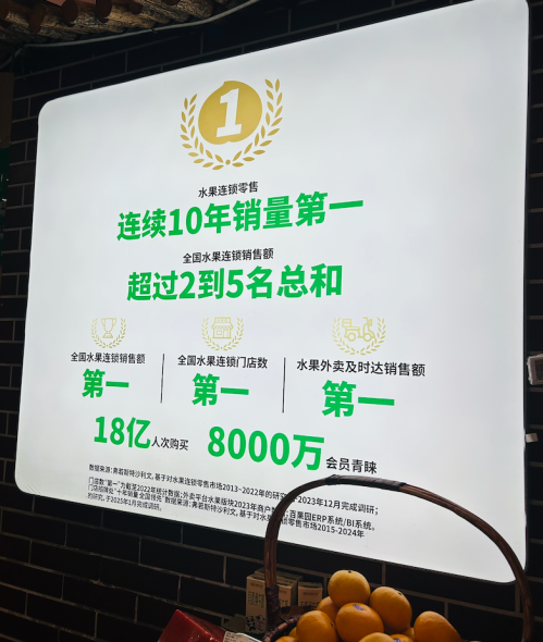 在百果园门店里,大都会挂着一块牌子,上面写着“连续10年销量**,超过2到5名总和”“18亿人次购买,8000万会员青睐”。