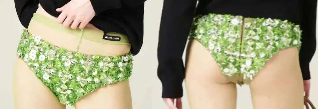 就如2023年爆火的Miu Miu“钻石内裤”,高达4.02万人民币一条,造型也十分“给力”,内裤前后缀满了钻石样的宝石,还有满满的亮片。