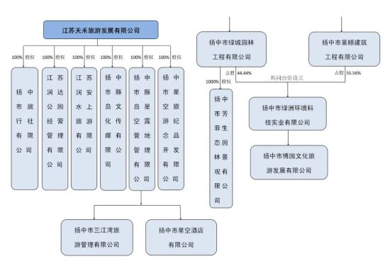 市政园林工程处100%控股的天禾公司,成立于2012年1月,实际控制包括扬中市旅行社有限公司、扬中市豚岛星空露营地管理有限公司等,皆为100%控股。扬中星空酒店有限公司则是扬中市豚岛星空露营地管理有限公司子公司。