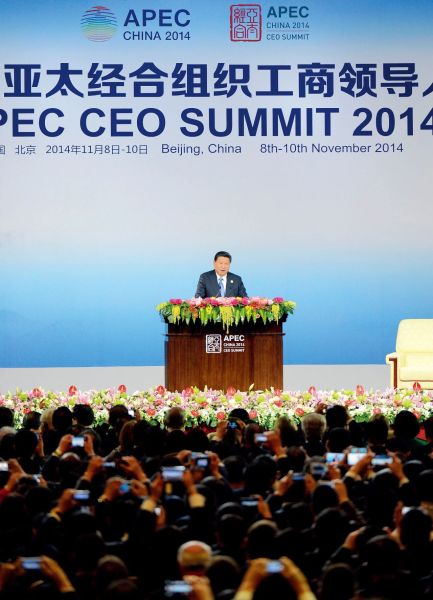 2014年11月9日,2014年亚太经合组织工商领导人峰会在北京国家会议中心举行,国家主席习近平出席开幕式并发表题为《谋求持久发展 共筑亚太梦想》的主旨演讲。图/中新