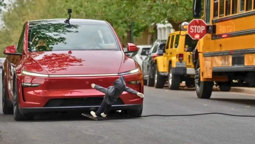 在模拟场景中,一辆开启FSD的特斯拉Model Y,8次均非法超越闪烁警示灯的停驶校车,而且还撞倒了试图过马路的儿童假人。