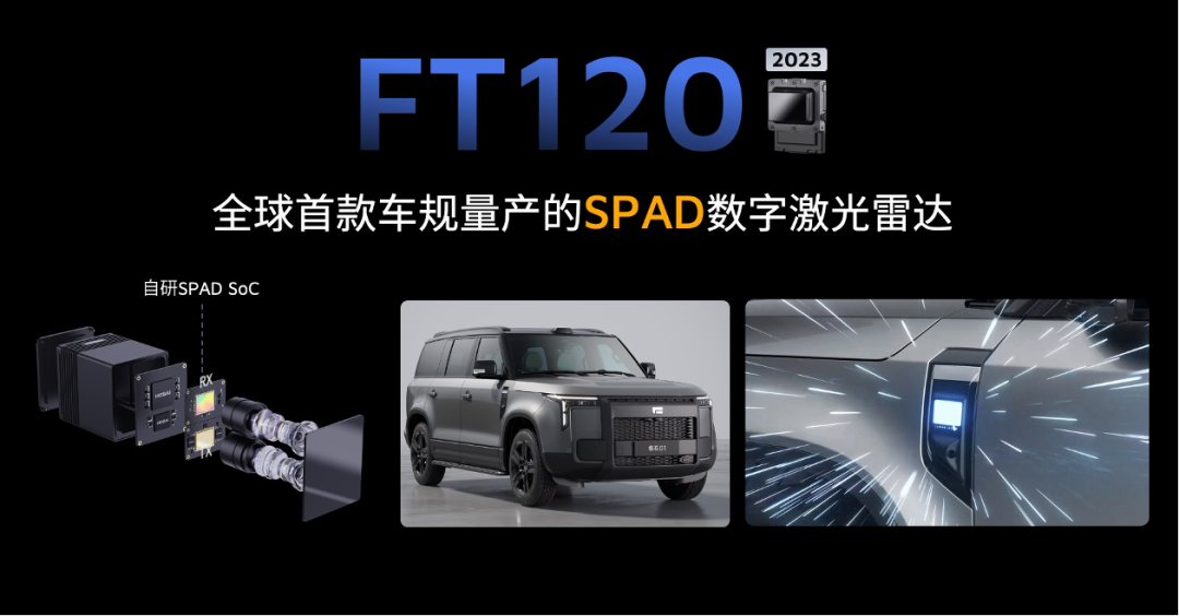 2022年发布的禾赛FT120补盲数字激光雷达,其实是全球首款车规量产上车的SPAD数字激光雷达,搭载在极石01车型上: