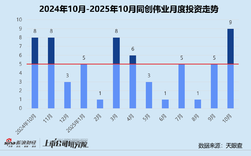 统计区间内,国泰君安创投公开披露的股权投资事件共9起,创下自2024年12月以来新高。往期数据显示,国泰君安创投在今年9月之前,整体投资节奏平缓,月均投资事件数长期稳定在2-3起,10月呈“爆发式”增长。