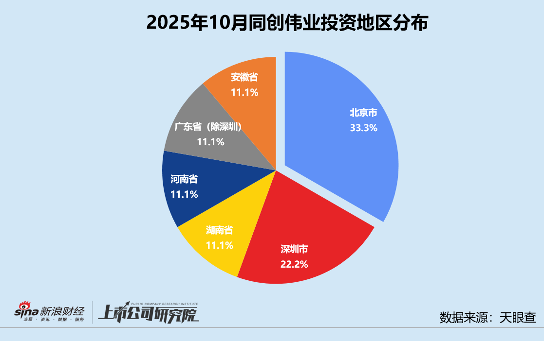 统计区间内,同创伟业公开披露的股权投资事件共9起,与2024年同期相比增长12.5%,环比激增80.0%。往期数据显示,同创伟业2024年10月、11月及2025年3月、10月投资活跃度较高,其余月份基本徘徊在中位数5起投资事件上下。
