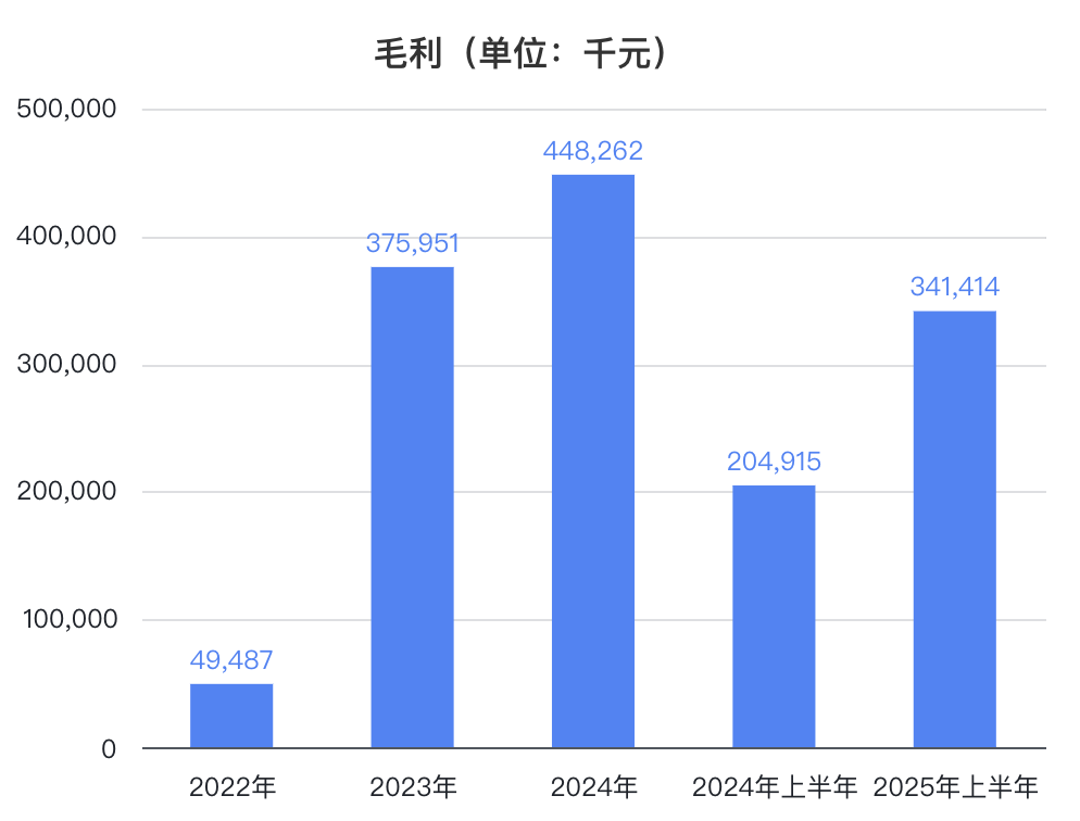 同期,毛利分别约为4948.7万元、3.76亿元、4.48亿元、3.41亿元人民币,对应毛利率从2022年的1.0%提升至2025年上半年的11.3%:
