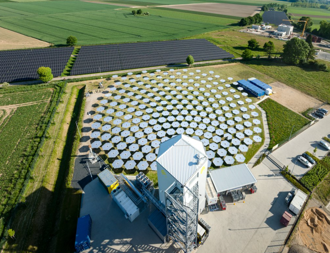 这一过程需要大量的热。Synhelion的方法是,通过一整套由AI校准的定日镜阵列(类似于超大反光镜,常用于太阳能光热发电站),把阳光集中到一座中央塔楼上。