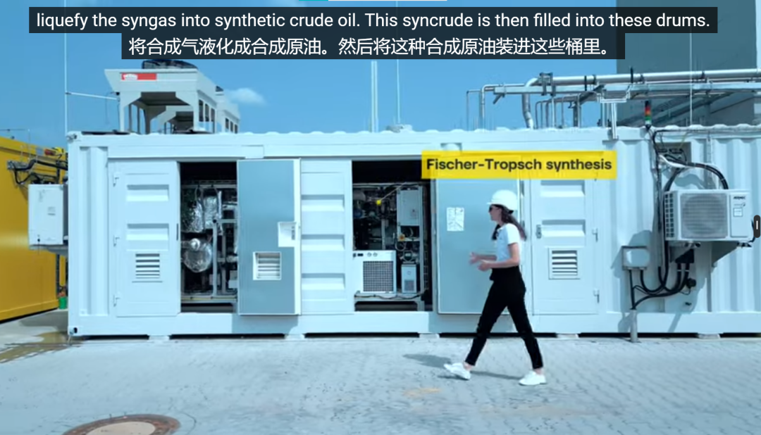 合成气被收集后,通过漏斗被输送到第三个部分。在那里经过一步转化,就变成了液态的“合成原油”。