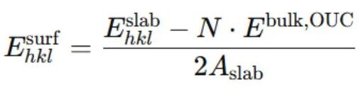 采用经验证的OUC+薄slab方案:slab厚度≥10Å、真空层≥15Å,并固定中间层原子以加速收敛。表面能按下式计算:
