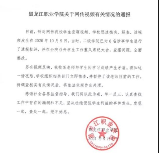 很快,该职业学院发出声明表示:经查,该视频发生于去年9月,已对6名涉事学生进行通报批评,并在全院召开学生工作正风肃纪大会,全面整改。