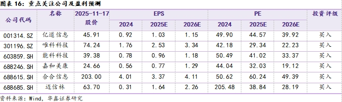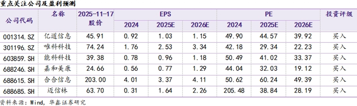中长期,建议关注临床AI产品成功落地验证的嘉和美康(688246.SH)、已与Rokid等多家知名AI眼镜厂商建立紧密合作的亿道信息(001314.SZ)、加快扩张算力业务的精密零部件龙头迈信林(688685.SH)、新能源业务高增并供货科尔摩根等全球电机巨头的唯科科技(301196.SZ),AI智能文字识别与商业大数据领域巨头的合合信息(688615.SH)、深耕工业AI与软件并长期服务高端装备等领域头部客户的能科科技(603859.SH)。