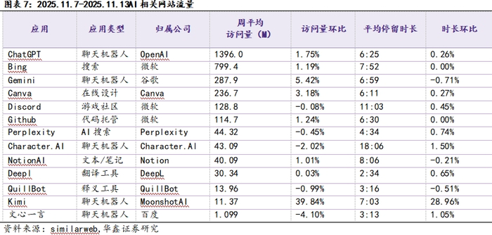 本期(2025.11.7-2025.11.13)AI相关网站流量数据:访问量前三位分别为ChatGPT(1396.0M)、Bing(799.4M)和Gemini(287.9M),访问量环比增速**为Kimi(39.84%);平均停留时长前三位分别为Character.AI(00:18:06)、Discord(00:11:03)和NotionAI(00:08:06);平均停留时长环比增速**为Kimi(28.96%)。