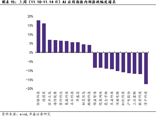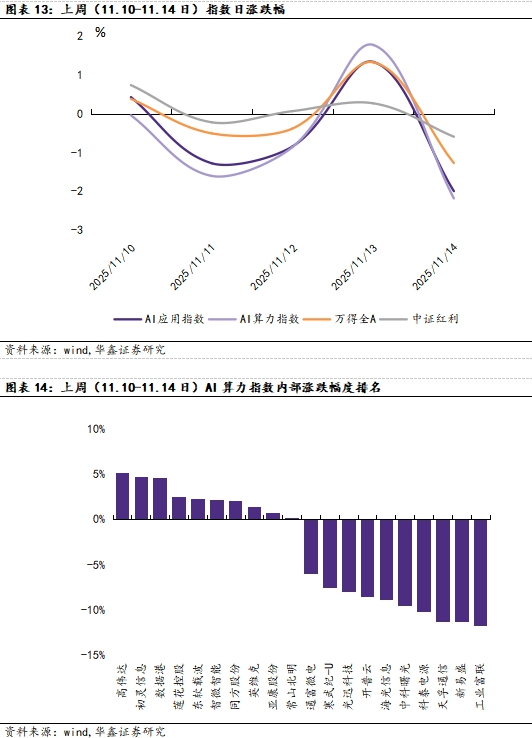 上周(11.10-11.14日),AI应用指数/AI算力指数/万得全A/中证红利日涨幅*大值分别为1.34%/1.78%/1.33%/0.74%,AI应用指数/AI算力指数/万得全A/中证红利日跌幅*大值分别为-2.00%/-2.18%/-1.27%/-0.59%。AI算力指数内部,高伟达以+5.10%录得上周*大涨幅,工业富联以-11.60%录得上周*大跌幅。AI应用指数内部,恒银科技以+17.94%录得上周*大涨幅,淳中科技以-17.43%录得上周*大跌幅。