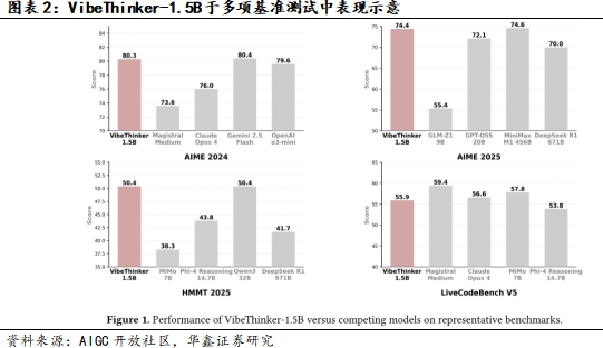 其训练过程(含SFT与RL阶段)共消耗3900个H800GPU小时,按市场租赁价格计算,总成本不足8000美元;而DeepSeekR1、MiniMax-M1的训练成本分别为29万美元、53万美元。由此可见,VibeThinker的成本效益比达到30-60倍。这一成本优势的来源包括:轻量化参数降低了计算资源需求;SSP框架的“精准训练”减少了冗余计算;数据策略上以开源数据集为主,仅少量构建专有数据。