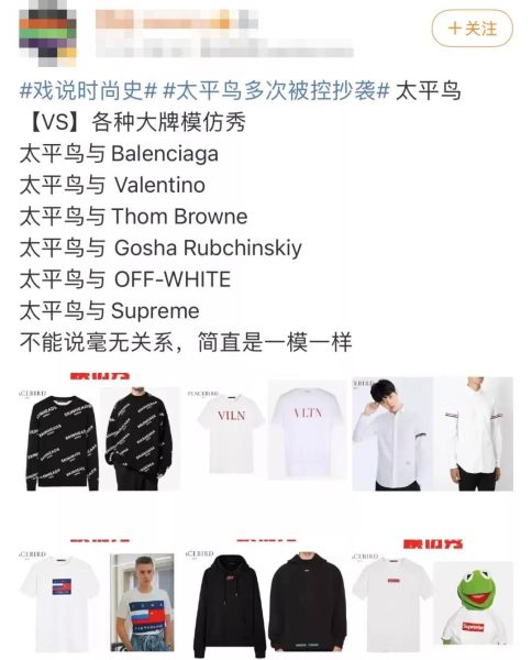 据了解,早在2020年,太平鸟与哈利波特合作的联名服装,就曾被曝涉嫌抄袭韩国品牌“unalloyed”。此外,还有网友扒出太平鸟的多款产品与Balenciaga、Valentino、Off-White、Supreme等品牌“不能说毫无关系,简直是一模一样”。