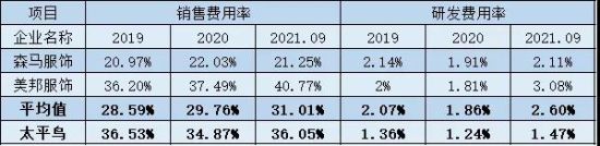 2019年至2021年9月,太平鸟研发费用占营业收入的比重分别为1.36%、1.24%、1.47%,而森马服饰、美邦服饰的研发费用率平均值分别为2.07%、1.86%、2.6%,均高于太平鸟。