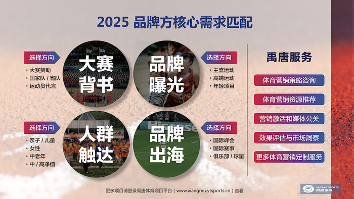 深耕体育营销领域18年,禹唐体育是全球知名的体育营销服务商,依托专业经验、全球项目资源网络、市场洞察、媒体影响力和国际视野,协助品牌方2025年在品牌出海、大赛营销、品牌曝光、人群触达等方面的核心需求匹配,具体服务包括: