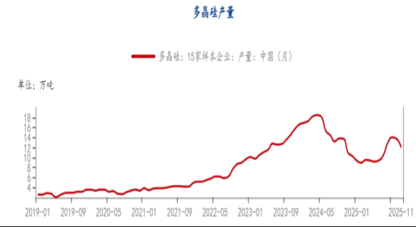 当前多晶硅厂家库存处于较高水平,接近3个月消费量水平。高库存意味着市场供大于求,企业为了出货,不得不降低价格,以吸引下游采购商。尽管有行业自律公约推动部分企业减产,且西南地区因枯水期电力成本攀升,中小厂商被动减产增多,但整体国内多晶硅产量仍维持较高水平,目前依旧维持在12万吨附近,头部企业开工率保持在七成以上,使得市场供应压力较大,库存难以快速消化,对价格形成压制。从下游光伏产业链需求全链条走弱。硅片环节,海外需求萎缩、外协代工订单减少,硅片库存持续累积,企业为缓解库存压力下调报价,对多晶硅采购意愿降低。电池片环节,受国内外需求同步收缩驱动,库存快速攀升,企业减产范围扩大,对多晶硅需求减少。组件环节,国内终端装机需求不及预期,海外步入传统淡季,组件产量下滑,进而减少了对多晶硅的需求。整体来看,多晶硅依旧处于供强需弱状态,预计未来价格依旧处于承压表现。