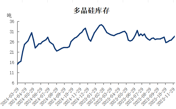 据我的钢铁网数据显示,截至 2025年12月05日,多晶硅厂库为 28.77万吨,同比上升3.38%,环比上周增加0.94万吨,整体多晶硅企业库存仍处于缓增趋势。