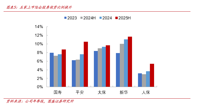 上市险企增配股票的力度和节奏各不相同。1)截至2025年二季度,新华、平安股票投资占比较高:新华11.6%、平安10.5%、太保9.7%、国寿8.7%、人保5.4%。2)新华、平安24、25年增配力度较大:股票投资占比较2023年末变动排名:平安+4.3ppt、新华+3.7ppt、人保+2.2ppt、太保+1.3ppt、国寿+0.8ppt。3)平安、新华、太保增配时间更早,自2024年上半年起增配,国寿、人保自2024年下半年起增配。