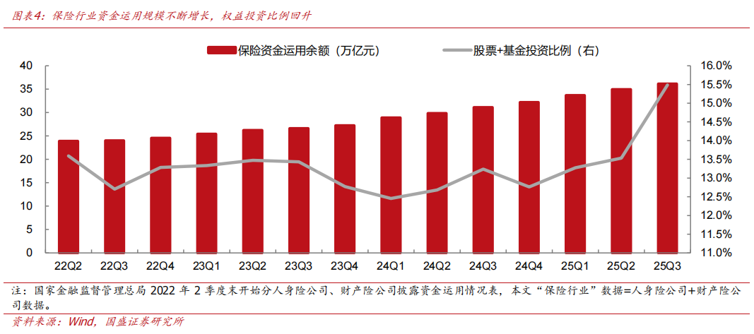 近年来,保险行业资金运用规模不断扩张,达到高点。保险行业权益投资(股票+基金)规模自2024年以来持续增长。截至25Q3末,保险行业资金运用余额36.12万亿元,其中股票和基金在保险资金运用余额中占比15.5%,达到*高点;保险行业股票配置规模累计达3.62万亿元(YoY+55.1%)。