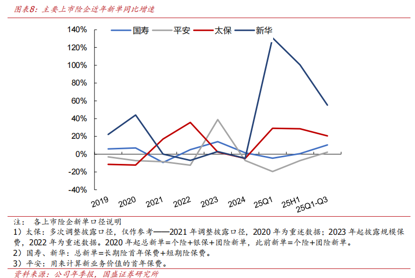 新单保费普遍增长,其中新华遥遥领先。随着银行存款利率持续下行,居民金融资产配置需求持续转向非银机构,保险产品吸引力凸显,推动2025年前三季度寿险负债端业绩高增。2025年前三季度总新单保费同比增速排名:新华55.2%、太保20.5%、国寿10.4%、平安2.3%。