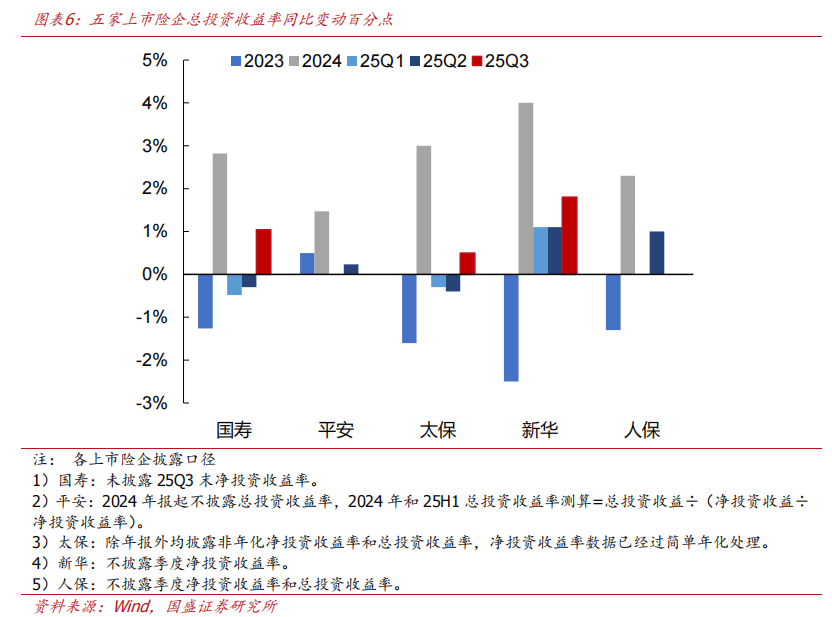 上市险企总投资收益率普遍较大幅提升,其中新华*为显著。截至25Q3末,总投资收益率表现为:新华8.6%(YoY+1.8ppt、QoQ+2.7ppt)、国寿6.4%(YoY+1.0ppt、QoQ+3.1ppt)、太保5.2%(YoY+0.5ppt、QoQ+2.9ppt)。
