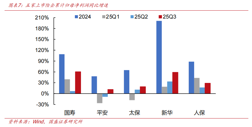 因各家险企OCI股票投资在总投资资产占比差异较大,进而影响市值波动对利润的贡献程度,2025年前三季度归母净利润增速表现差异较大:国寿+60.5%、新华+58.9%、人保+28.9%、太保+19.3%、平安+11.5%。