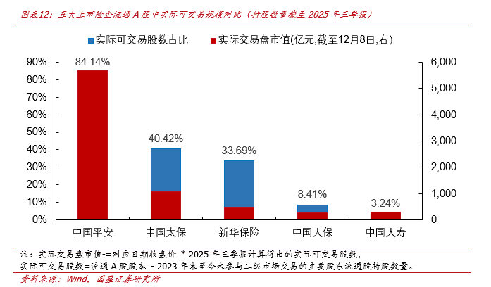 国寿、新华实际流通A股股数较少、实际交易盘市值较小、股价弹性更大。上市险企流通A股股本中实际可交易股数占比分别为:国寿3.24%、平安84.14%、太保40.42%、新华33.69%、人保8.41%。以2025年12月8日收盘价和2025年三季报股数为基础计算,流通A股股本中实际交易盘市值分别为:国寿307亿元、平安5687亿元、太保1058亿元、新华477亿元、人保262亿元。