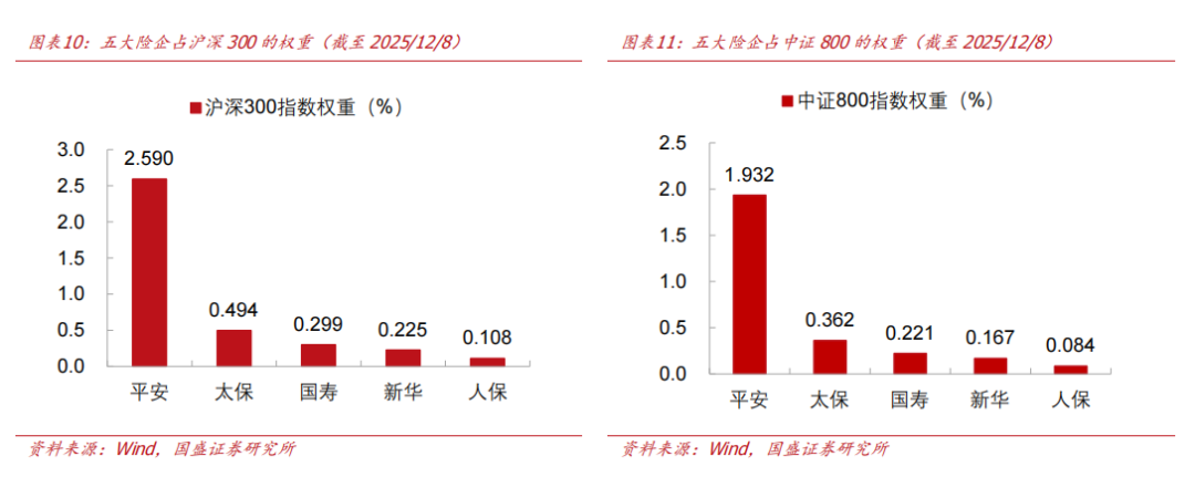 在沪深300指数中,五大险企整体权重集中于平安。1)沪深300五大险企的权重分别是:平安2.59%、太保0.494%、国寿0.299%、新华0.225%、人保0.108%。2)中证800指数中,五大险企权重有所稀释,但仍以平安为主导:平安1.932%、太保0.362%、国寿0.221%、新华0.167%、人保0.084%。