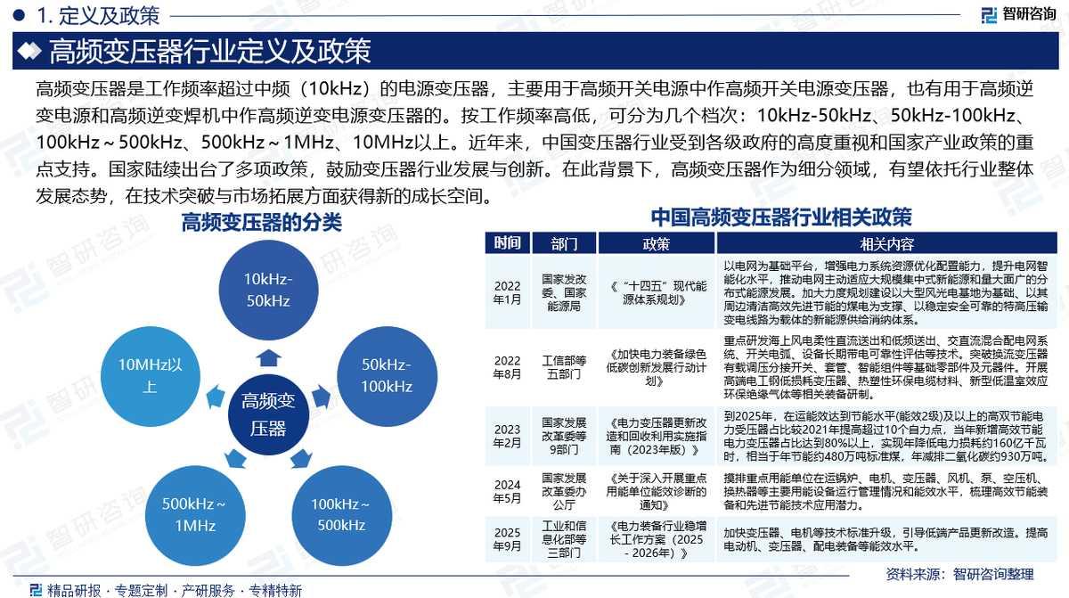 行业政策:变压器是一种利用电磁感应原理改变交流电压的电气设备,其核心作用是实现电压的转换与传输优化。近年来,中国变压器行业受到各级政府的高度重视和国家产业政策的重点支持。国家陆续出台了多项政策,鼓励变压器行业发展与创新。在此背景下,高频变压器作为细分领域,有望依托行业整体发展态势,在技术突破与市场拓展方面获得新的成长空间。例如,2024年5月,国家发展改革委办公厅印发《关于深入开展重点用能单位能效诊断的通知》,摸排重点用能单位在运锅炉、电机、变压器、风机、泵、空压机、换热器等主要用能设备运行管理情况和能效水平,梳理高效节能装备和先进节能技术应用潜力。2025年9月,工业和信息化部等三部门印发《电力装备行业稳增长工作方案(2025-2026年)》,加快变压器、电机等技术标准升级,引导低端产品更新改造。提高电动机、变压器、配电装备等能效水平。