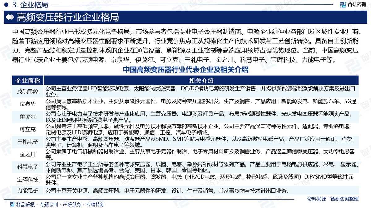 企业格局:中国高频变压器行业已形成多元化竞争格局,市场参与者包括专业电子变压器制造商、电源企业延伸业务部门及区域性专业厂商。随着下游应用领域对高频变压器性能要求不断提升,行业竞争焦点正从规模化生产向技术研发与工艺创新转变。具备自主创新能力、完整产品线和稳定质量控制体系的企业在通信设备、新能源及工业控制等高端应用领域占据优势地位。当前,中国高频变压器行业代表企业主要包括茂硕电源、京泉华、伊戈尔、可立克、三礼电子、金之川、科慧电子、宝晖科技、力能电子等。