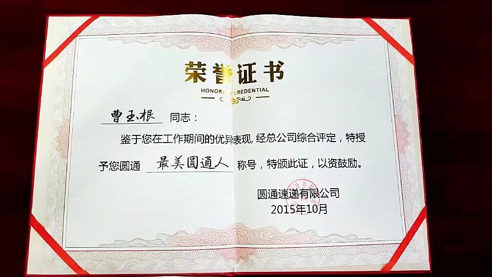 曹玉根曾被圆通速递评为“*美圆通人”。摄影/本刊记者 周群峰