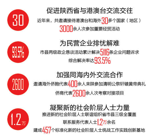 近年来,陕西省立足文化资源,持续深化与港澳台同胞的情感联结;通过搭平台、树品牌、探新路、压责任,有效激活新的社会阶层人士统战工作;创新打造“政企恳谈会”等沟通机制,积极构建亲清政商关系……这些扎实举措,不仅是新时代统战工作的有效探索和重要突破,也为陕西省高质量发展提供持续而强劲的助力。