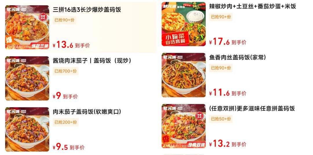 如果是外卖店盖码饭,那价格甚至算得上便宜。一份盖码饭*低不到10元,双拼盖码饭也不超过20元,部分盖码饭品牌门店推出的“一口价”产品,三拼盖码饭也只需要13.6元。