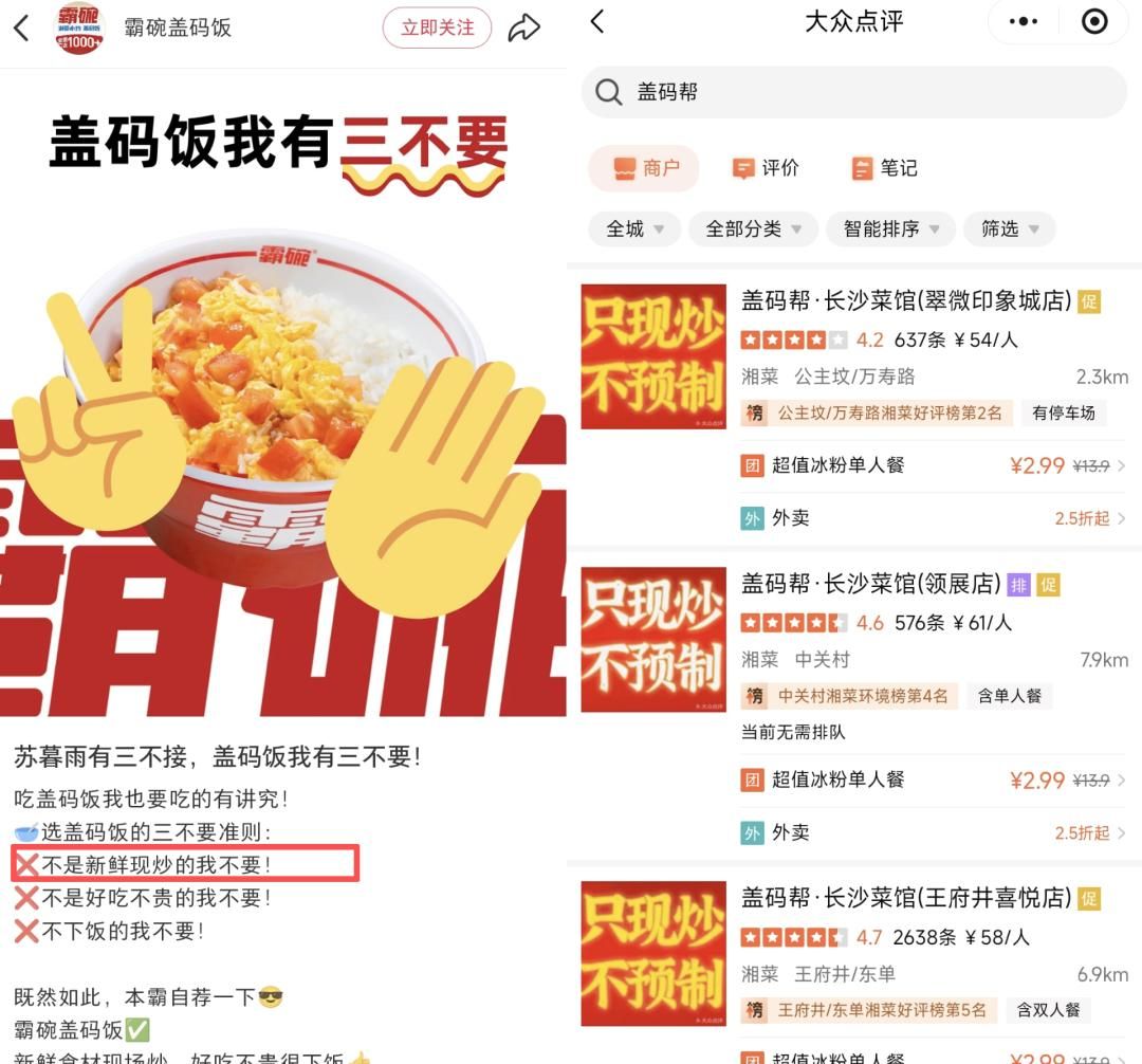 更别提,盖码饭还是现炒为主。盖码帮打出了“只现炒 不预制”的标语,霸碗盖码饭也表示盖码饭有三不要,其中之一就是“不是新鲜现炒的我不要”。