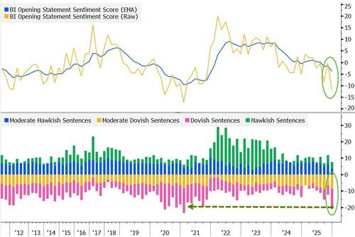 彭博利率策略自然语言处理模型显示,鲍威尔本月发布会的开场白比10月会议更显鸽派,且是自2021年以来*鸽派的表态。关注该模型的策略师Jersey指出,围绕资产购买的评论是推动这一转变的主要因素...
