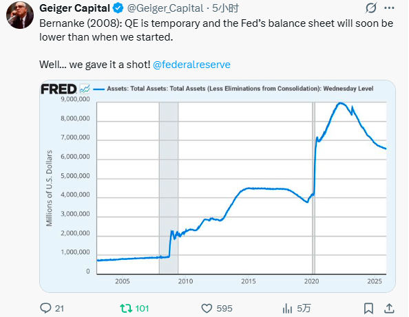同时,有业内人士也不禁翻出了美联储前主席伯南克2008年时的一番表态——当时伯南克曾承诺,量化宽松是暂时的,美联储的资产负债表很快就会比我们开始时的规模更小。