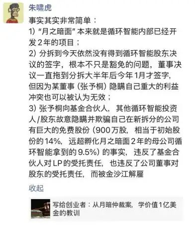 仅仅一个月后,朱啸虎又将矛头直指张予彤。他在朋友圈发文称,张予彤向基金合伙人、其他循环智能投资人/股东故意隐瞒并欺骗自己在新拆分的公司有巨大的免费股份(初始股份的14%)的事实。