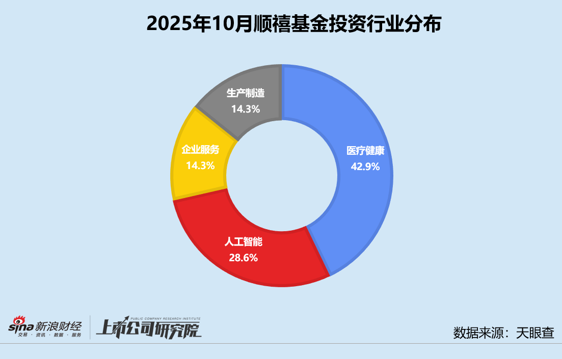 从所关注的行业赛道来看,顺禧基金医疗健康和人工智能是绝对重仓领域,其中医疗健康公司约占比42.9%,覆盖医疗技术、医疗器械等细分赛道;人工智能项目约占比28.6%,主要投向AIGC公司;企业服务和生产制造行业是辅助布局,获投项目各占14.3%。