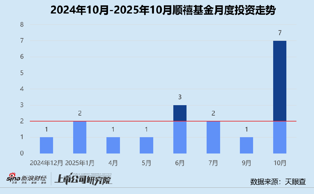 统计区间内,顺禧基金公开披露的股权投资事件共7起,是自2024年12月以来的*高值。往期数据显示,顺禧基金在10月之前每月投资次数维持在1-3次,10月激增至7次,活跃度显著提升。
